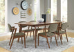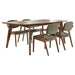 Craft a modern motif with the clean lines and retro-like feel of this five-piece dining set. Mid-century modern design gets a contemporary makeover with overtly angled details. Thin, tapered legs and angles marry on both the table and four side chairs. Open and visually interesting, the chairs feature warm brown upholstery along the seat and back. Charming details and design create a clean set that looks great in large and small spaces. Key Features: • Five-piece dining table set features rectangular table and four matching side chairs • Dark walnut wood finish adds a rich tone to the mid-century modern dining aesthetic • Chairs include gently curved backrests with angled legs and low-profile arms • Upholstered seating in warm brown fabric with subtle texture for added comfort • Constructed from solid rubberwood, engineered wood, and walnut veneer • Polyester-cotton blend upholstery offers a soft touch with easy maintenance