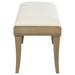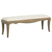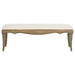 This French Provincial-inspired bed-end bench combines timeless elegance with functional comfort. Framed in solid poplar, engineered wood, and mango veneer, it features a washed mango finish that highlights the natural wood grain. The cushioned seat is upholstered in soft ecru fabric, offering a refined touch and a comfortable place to sit. Gracefully curved legs and scalloped detailing enhance its classic design, making it a perfect accent piece for the foot of the bed or additional seating in any space.