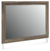 Casually cool style and clean lines go hand in hand with this bedroom mirror. A weathered brown finish over replicated oak grain creates an easygoing vibe, setting the scene in your restful retreat. The fuss-free, versatile piece can be mounted on a wall or dresser.