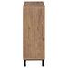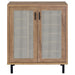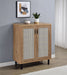 Enhance your entryway with this stylish shoe cabinet, pairing natural oak hues with modern, functional details. Crafted from engineered wood and laminate veneer, it features double doors framed by airy metal cane-style panels. Inside, an off-centered division and multiple adjustable shelves accommodate various shoe sizes, ensuring a personalized storage solution. Sturdy black metal legs anchor the piece, delivering a contemporary look that effortlessly streamlines your footwear collection.