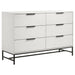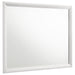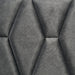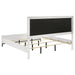 Reimagine your bedroom retreat with the crisp, clean appeal of a modern four-piece bedroom set. Its clean, precise style is emphasized with sleek silhouettes and a bright white finish. The set centers on a chic bed with a tall headboard and low footboard, offering fresh style with geometric tufting in dark gray padded upholstery. Black finish legs complete the bed and bring cohesive style to the set, matching bases and hardware on the dresser and nightstand. The dresser offers plenty of storage and includes a framed mirror on top, adding bright reflectivity to your bedroom ensemble.
