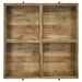 This farmhouse shadowbox coffee table set brings a cohesive charm to your living room. Each piece features a tempered glass top, offering a clear view of memorabilia stored in multiple compartments, accessed by drop-front doors with chain suspension for added character. Crafted from solid mango wood in a warm honey brown finish, the set exudes natural warmth. Sleek iron bases with black finishes provide sturdy support and modern industrial appeal, creating a stylish yet functional living room centerpiece.