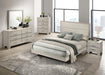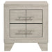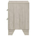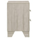 This contemporary two-drawer nightstand brings a chic blend of rustic and modern design to your bedside. Crafted with a rustic cream finish over rough-sawn, white-washed engineered paper veneer, it exudes a warm, textured appeal. Extra-wide polished nickel handles offer a sleek contrast to the rustic tones, adding a touch of sophistication. Built with engineered wood and featuring durable English dovetail joinery and Center metal glides, this nightstand is as functional as it is stylish, providing ample storage in a compact, modern silhouette.