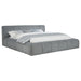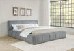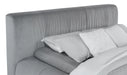 Thick, indulgent cushioning creates a refined but inviting ambiance for this modern upholstered bed. Its a low-slung silhouette that creates a true retreat from the word, with plush foam and soft dove gray fabric upholstery that showcases gentle, organic pleating to create a lived-in look and feel. The bed features a thick, low headboard wonderful for lounging, and pairs it with wide rails and a matching footboard. A recessed platform hosts the mattress of your choice (not included) and creates a cozy and inviting spot for rest and relaxation. It's the perfect centerpiece for an indulgent, contemporary bedroom. Key Features: • Extra-plush, this modern upholstered queen bed creates a haven from the world in your own bedroom • Soft dove gray fabric and plush foam create indulgent comfort and a wonderfully inviting look • Organic pleating creates a relaxed, lived-in look and feel without compromising is lush ambiance • A center rails adds abundant support and structure to ensure a stable platform for sleep • Support legs feature levelers to create stability on any flooring surface