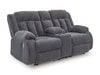 There's no need to sacrifice looks for comfort—this power reclining loveseat with console serves up both, plus a richly relaxed sense of style. Its chocolate-hued velvet upholstery is ultra soft, with a plush waffle weave for an added layer of interest. The overstuffed pillow top armrests are custom made for lazy afternoon catnaps. A one-touch power control takes the pleasure of reclining to a higher level, while cup holders and USB charging help keep essentials close by.
