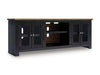 Raise the bar on modern farmhouse style with the Wildenauer TV stand. Its sturdy silhouette and casual good looks are accentuated with a two-tone finish, which pairs a warm satin black base with a contrasting butcher block veneer top. Glass door cabinets with adjustable shelves offer plenty of storage for media and electronics. And removing the center cabinet’s shelf allows room for the optional fireplace insert (sold separately), adding instant warmth and romance. Whether your style is vintage, country or eclectic, this TV stand adds a hearty element.