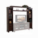 The Halden collection transitional style will blend masterfully in your living room area. This set features a shelf bridge with light function, and its two side piers offer plenty of space to keep entertainment components or your favorite decorative accessories. Carefully constructed from selected wood and veneers in rich Merlot Finish giving this piece a stunning and sleek appeal.