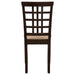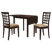 Maximize your dining space with this transitional three-piece dining set that's perfect for a breakfast nook or an apartment setting. The cozy set features a table with a drop-leaf extension and two (2) two-tone lattice-back chairs. The table is crafted with solid block legs and comes in a warm cappuccino finish. The stylish chairs are upholstered in a cushioned tan fabric and tapered legs with the same cappuccino finish as the table. It's a perfect set for a cozy gathering.