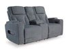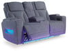 Chill-out time has never looked better. This power reclining loveseat's adjustable headrest ensures a perfect view of the TV no matter how far back you recline, while the extended ottoman takes your comfort to the next level. Handy charging features and storage cutouts put phones and e-readers at your fingertips. Plush yet practical Next-Gen Nuvella™ performance fabric and ambient lighting complete the theater-style experience. It's time to relax, nap or binge-watch in the best seat in the house.
