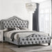 Enhanced with self-welt trim, this bell style headboard adds an ornate and traditional touch to your sleeping space. Button tufting adorns this piece with classic button accents. Intricately applied nailhead trim further enhances the style of this headboard. Upholstered in luxurious grey felt, this is a comfortable and stylish addition to your space. Complete the look of your bedroom with a traditional headboard with modern elements.