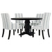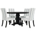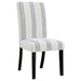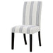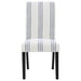 This dining chair blends casual elegance with functional comfort, making it a versatile addition to dining spaces. Upholstered in a linen-like beige fabric with subtle blue stripes, it adds a relaxed yet refined aesthetic. The chair features a padded seat and backrest, ensuring comfort during meals or gatherings. Supported by a sturdy Asian hardwood frame with a sleek black finish, the design balances durability and style. Perfect for modern, farmhouse, or transitional decor styles.