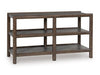 Master the art of mixed-material design with this sofa table. It sports an urban vibe, with faux cement lending an industrial edge to the contrasting dark brown finish. For a functional touch, lower shelves showcase your decor in style. Detailed mouldings on the side add even more cool character.