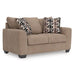 Transitional and right on trend. This loveseat's upholstery is a delightful change from the ordinary, with hints of soft brown giving the gray hue added depth. It’s punctuated with chic accent pillows in an eye-catching, stylized stripe design. Whether you're hosting friends and family or relaxing solo, this loveseat invites homey, comfortable character into your space.