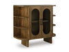 This accent cabinet puts a uniquely chic spin on a classic storage solution. It seamlessly blends clean lines with mid-century inspired curves, donning a light brown finish for that much more versatility. Exposed side shelves eagerly welcome your favorite decorative pieces, while additional shelves behind the glass-paneled doors offer ample storage.