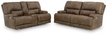 Expansive and elegant, this power reclining seating package makes a sizable style statement. Its large scale enhances the luxe look and magnifies the beauty of faux leather in an earth tone, punctuated with jumbo stitching. One-touch power adjustable headrests mean infinite ways to recline in stylish comfort. USB charging completes the experience.