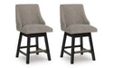 Casual contemporary design. Made with hardwood solids, Mango wood veneer, and MDF substrate. Finished in a modern, trend-right dark gray brown wood tone. The clean lined contemporary styled D618-35 dining table features a thick top silhouette with a self storing butterfly leaf. D618-13 counterheight table features clean lined contemporary styling with a thick top silhouette. Chairs feature a modern styled design with decorative fabric loops capturing the mid back rail and a convenient cut-through hand grab at the top rail. Chairs feature light gray Next-Gen Nuvella™ performance fabric for worry free cleanability. All chairs in this collection have adjustable levelers.