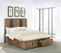 Sleek vertical embellishments create incredible texture and depth for a modern wooden storage bed. A pair of drawers are tucked in the footboard, w...