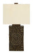This table lamp impresses with its versatile neutral character and geometric appeal. A pattern of circles and curves beautifully contrasts with the clean-lined silhouettes of the base and shade. With an antiqued brown finish lending a vintage vibe, this lamp is a bright idea for classic or casual spaces.