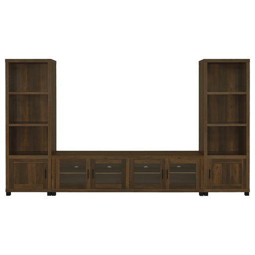 Elevate your living area with our rustic urban TV stand, a perfect blend of timeless aesthetics and modern functionality. Highlighted by striking black hardware accents, this piece boasts four ample compartments that ensure your media devices are organized and easily accessible. A sophisticated glass door juxtaposed with fixed shelves adds both style and practicality. For those seeking added storage and a cohesive look, pair this stand with our matching media towers. The stand's boxy silhouette, complemented by smooth surfaces and versatile adjustable shelves, offers a contemporary touch, ensuring it's not just a furniture piece but a statement of design excellence.